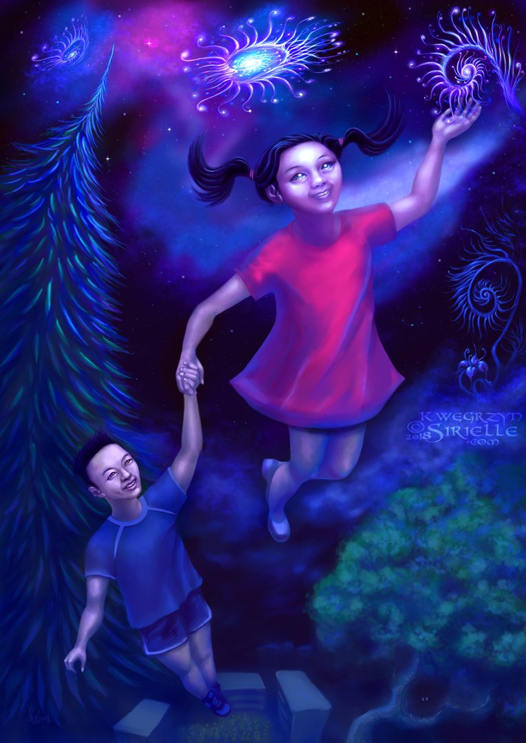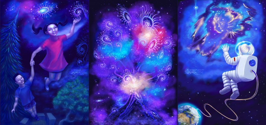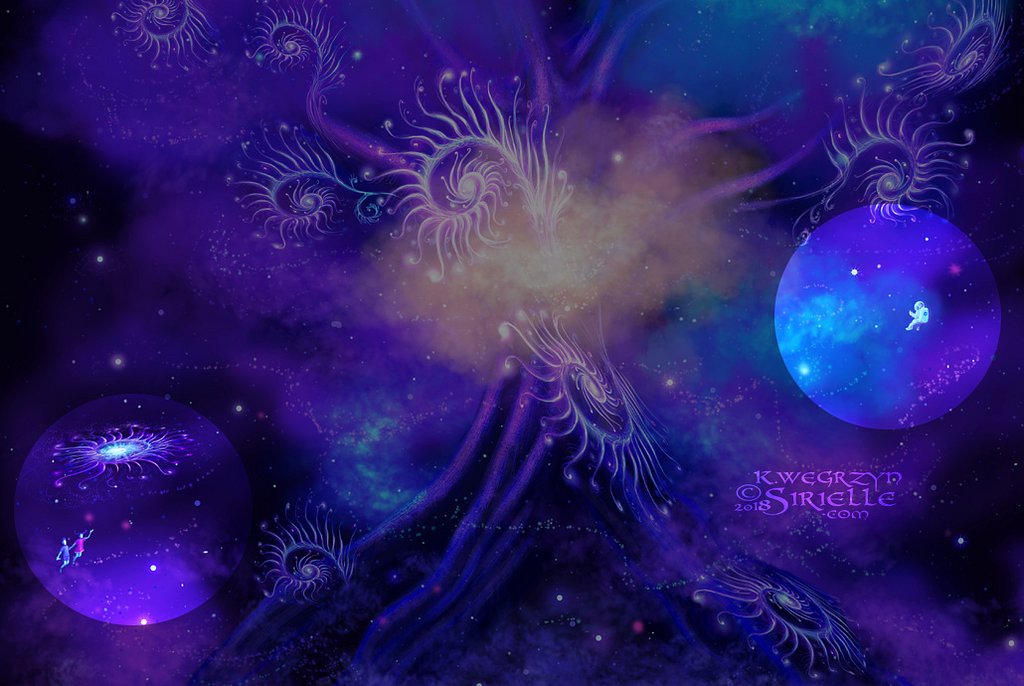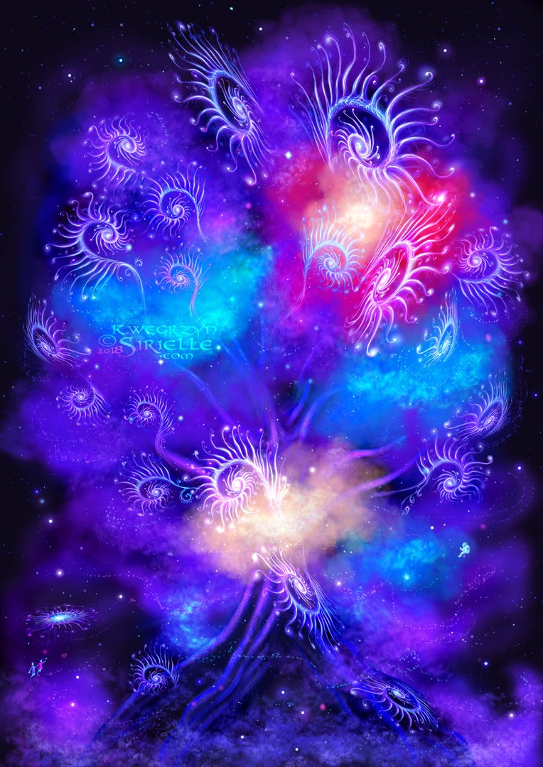 Inspired by cosmic Tree of Life and Yggdrassil from Norse mythology, yet instead of mythical realms it is filled with magical, wish fulfilling ferns and colorful galaxies.